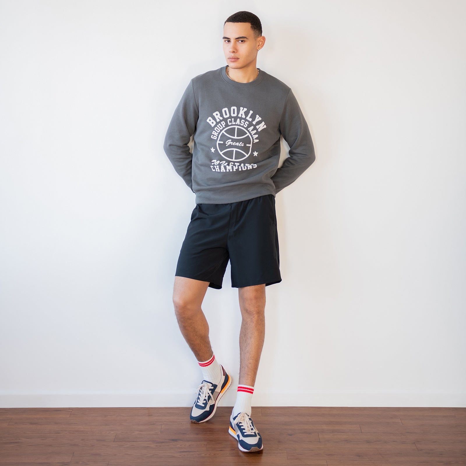 Our newest way to pay homage to our hometown of Brooklyn. Our graphic baseball crew is an essential layer, made elevated. Heavyweight GOTS-certified organic cotton comes together with recycled polyester (for that earth-friendly feel). Then, we finish our crew with the little details that make a big difference: flatlock stitching for sleeker, more durable seams, super-soft brushed fleece interior, and flat-knit side ribbing for stretch. From sitting courtside to meeting deskside, it's your new go-to.